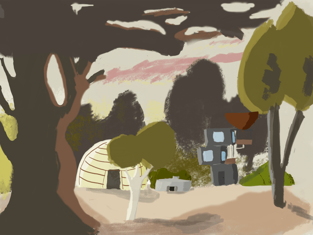 I care a lot about sustainable design and architecture and created a quick sketch of a fantasy world inspired by her brush strokes and composition.