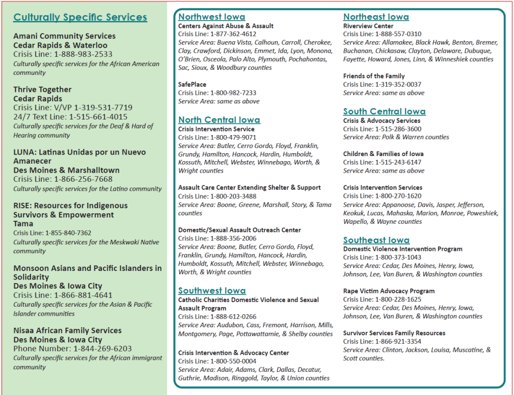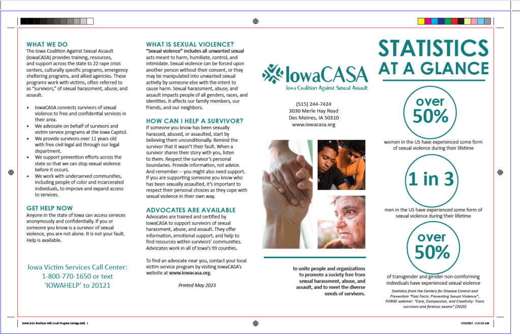 Two versions of a brochure for sexual assault survivors and allies. The first version re-created a print-ready digital file of an existing quad-fold publication. The second version offered a different perspective on relevant content and placement.